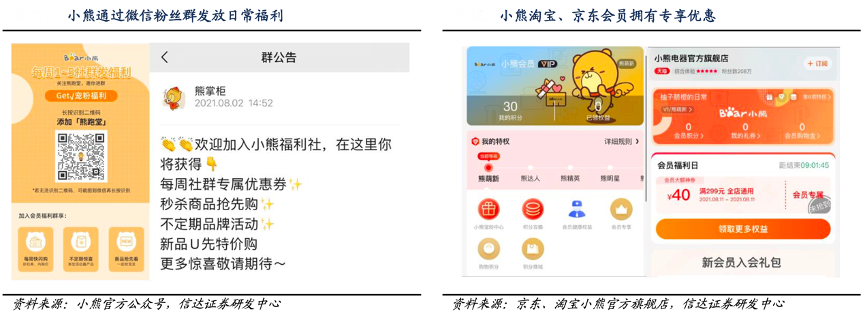 經典案例:根據小熊官方公眾號、京東、淘寶小熊官方旗艦店、信達證券研發(fā)中心等綜合資訊表明,小熊通過微信群的方式進行社群營銷,以社群專屬優(yōu)惠券、秒殺商品搶先購、新品優(yōu)先特價購買等方式吸引消費者,有效提高用戶黏性。小家電本身使用周期短、更新?lián)Q代快,高用戶黏性可有利于提高消費者對小熊產品的復購率。