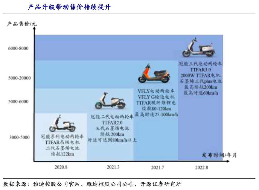經(jīng)典案例:根據(jù)雅迪控股公司官網(wǎng)、雅迪控股公司公告、開源證券研究所等綜合資訊表明,作為雅迪控股的主打產(chǎn)品之一,冠能系列在 2021 年進(jìn)行大規(guī)模市場推廣,2021H1 銷量占總銷量的比重為24%,其產(chǎn)品售價(jià)不斷提升,冠能系列一代、二代、三代的價(jià)格帶分別為 3000-5000元、5000-6000元、6000-8000 元,毛利率有望進(jìn)一步提高。