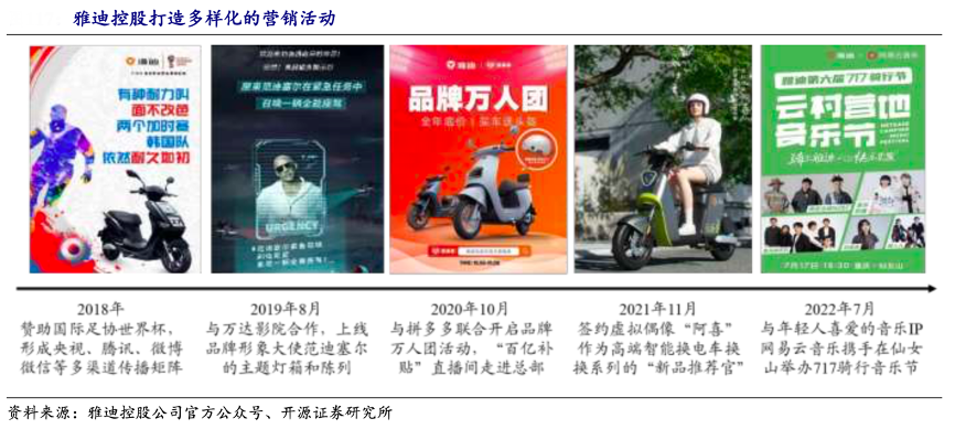 經(jīng)典案例:根據(jù)雅迪控股公司官方公眾號、開源證券研究所等綜合資訊表明,2018 年,雅迪控股贊助國際足協(xié)世界杯,形成央視、騰訊、微博、微信等多渠道傳播矩陣;而2022年7月,雅迪控股與年輕人喜愛的音樂 IP 網(wǎng)易云音樂攜手在仙女山舉辦 717 騎行音樂節(jié)。雅迪控股通過贊助、代言,以及 IP 聯(lián)動等多種方式,拓寬渠道,增強(qiáng)消費(fèi)者對品牌的認(rèn)知程度。