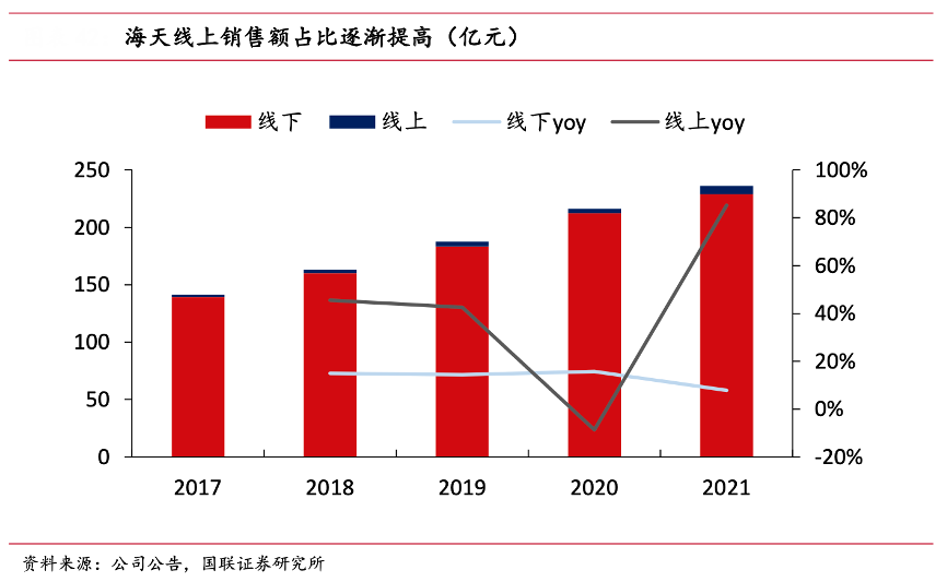 經典案例:根據公司公告、國聯證券研究所等綜合資訊表明,海天公司線上銷售額穩定增長,2021 年線上銷售規模達到 7.04 億元,同比增長 85.2%,占營收比重約 2.98%。海天適應年輕消費群體不斷變革的消費習慣,順應消費新趨勢,持續鞏固海天在新零售上的競爭優勢。