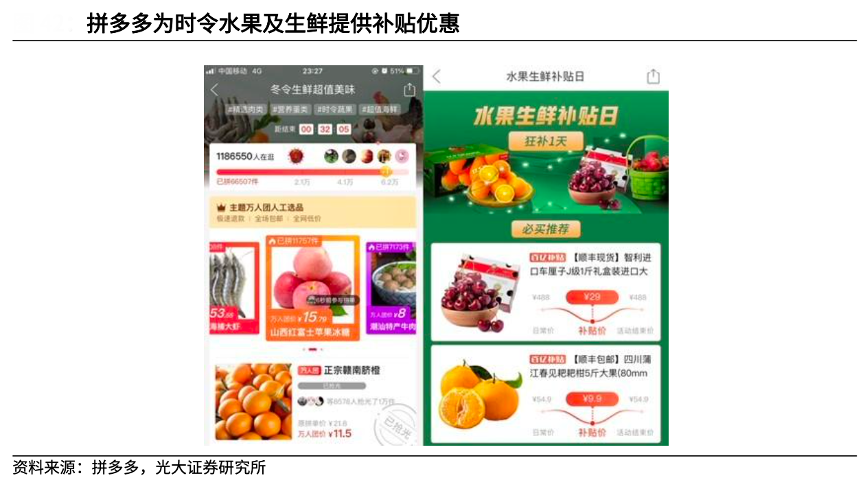 經(jīng)典案例:根據(jù)拼多多、光大證券研究所等綜合資訊表明,淘寶、京東、拼多多等電商平臺(tái)均在助農(nóng)上用力著墨,拼多多的助農(nóng)行動(dòng)由來(lái)已久,在 2Q2021,拼多多設(shè)立 100 億農(nóng)研專項(xiàng),推出原產(chǎn)地直發(fā)、對(duì)農(nóng)產(chǎn)品進(jìn)行直播扶持、人才培育、供應(yīng)鏈優(yōu)化等多種舉措,履行社會(huì)責(zé)任。