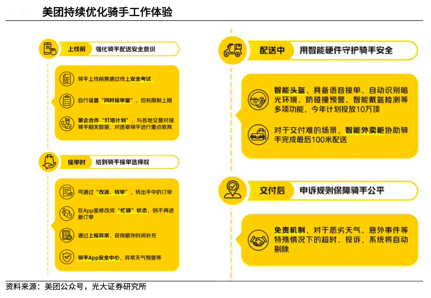 經(jīng)典案例:根據(jù)美團(tuán)公眾號(hào)、光大證券研究所等綜合資訊表明,作為連接消費(fèi)者和商戶的平臺(tái)方,美團(tuán)在疫情期間積極承擔(dān)社會(huì)責(zé)任,協(xié)助商戶渡過(guò)難關(guān),例如對(duì)經(jīng)營(yíng)困難的中小商戶提供傭金優(yōu)惠、免費(fèi)提供外賣(mài)管家服務(wù)和智能運(yùn)營(yíng)設(shè)備。同時(shí),美團(tuán)持續(xù)改善騎手待遇,優(yōu)化騎手規(guī)則,例如 2022 年 5 月,美團(tuán)出臺(tái)一系列騎手勞動(dòng)安全保障措施,優(yōu)化騎手接單全流程。