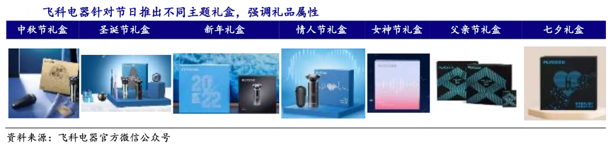 經(jīng)典案例:根據(jù)飛科電器官方微信公眾號、開源證券研究所等綜合資訊表明,飛科電器在 2021 年父親節(jié)、“618”、七夕、“818”等多個節(jié)日和平臺活動期間 位列品牌和類目榜單第一,創(chuàng)造多項個護(hù)電器抖音自播新記錄。同時針對節(jié)日推出主題禮盒款,與節(jié)日很好契合,充分體現(xiàn)個護(hù)產(chǎn)品的禮品屬性。