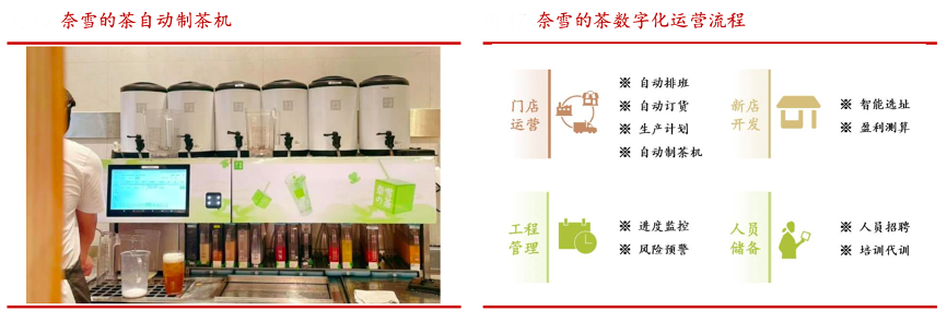 經典案例:根據公司年報、市場信息、華西證券研究所等綜合資訊表明,奈雪的茶數字化改造貫穿整個開店環節,在門店運營端更具可實施性,自動排班系統、自動訂貨系統、自動制茶機等數字化設施的投入使用,使得人力效率得到了明顯提升。同時,新店開發的智能選址、盈利測算,門店開業的證照管理、營業額預測,工程管理的進度監控、風險預警等流程的數字化改造,也將有效助力其降本增效。
