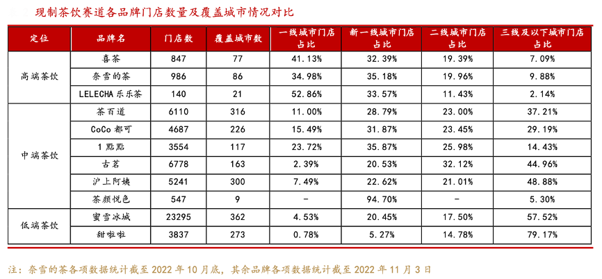 經典案例:根據各公司年報、各品牌官網、各市場信息、華西證券研究所等綜合資訊表明,從覆蓋城市等級看,高端茶飲品牌積極布局高線城市,提升品牌認知度。 喜茶、 奈雪的茶、樂樂茶二線及以上城市門店占比分別為92.91%、90.12%、97.86%,均維持在九成及以上水平。