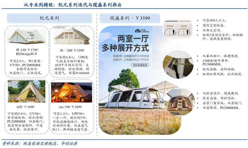 經(jīng)典案例:根據(jù)牧高笛淘寶旗艦店、華創(chuàng)證券等綜合資訊表明,牧高笛隨精致露營消費潮流到來,于 2020 年推出“紀元”系列,定位高端精致露營市場,內(nèi)部空間大幅擴大,契合精致露營場景需求;2021年公司推出“攬盛”梯形隧道帳篷,活動空間更大,上市后始終占據(jù)銷量前列,成為公司另一大爆款產(chǎn)品;顏色方面公司推出純霧白,理念為“用東方色彩裝點東方山水”。