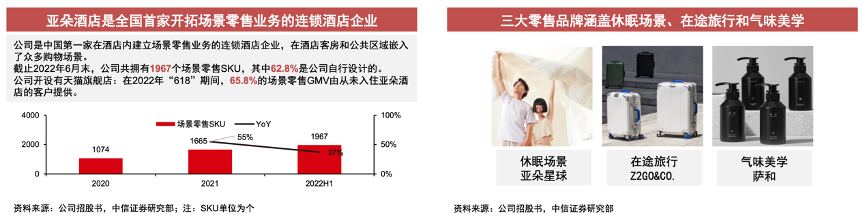經(jīng)典案例:根據(jù)公司招股書、中信證券研究部等綜合資訊表明,亞朵酒店是全國(guó)首家開拓場(chǎng)景零售業(yè)務(wù)的連鎖酒店企業(yè),以三大零售品牌涵蓋休眠場(chǎng)景、在途旅行和氣味美學(xué)等方面。