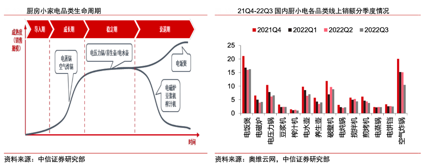 經典案例:根據奧維云網、中信證券研究部等綜合資訊表明,品類分化趨勢明顯,空氣炸鍋爆發增長,結合奧維云網數據,21Q4-22Q3 空氣炸鍋線上銷額分別為 20.1/15.2/15.1/10.3 億元,與電飯煲的線上銷額相近(21.1/16.8/16.0/16.2 億元)。此外,空氣炸鍋銷售額增長速度亮眼,22H1線上銷額同比+163%,空氣炸鍋的興起體現了人們對美好/健康/精致生活的追求。