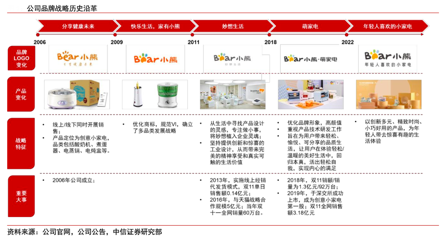 經典案例:根據公司官網、公司公告、中信證券研究部等綜合資訊表明,小熊電器公司的品牌戰略發展主要分為五個階段,其中的分享健康生活(2006-2008 年),公司成立之初定位于健康小家電,產品以酸奶機 煮蛋器、電蒸鍋、電燉盅為主,之后逐步創新推進。
