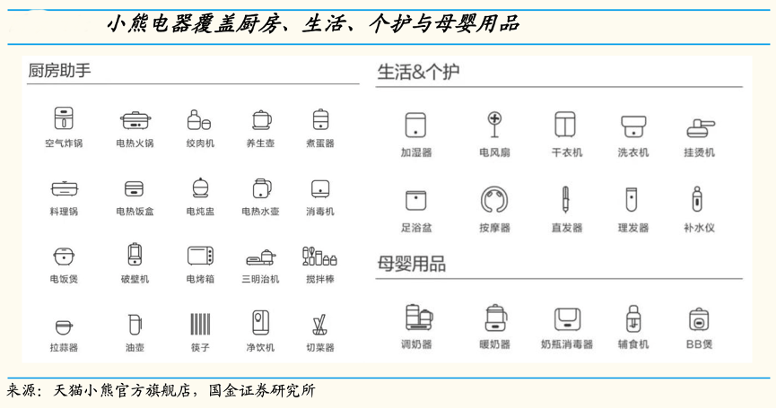 經典案例:根據天貓小熊官方旗艦店、中信證券研究部等綜合資訊表明,小熊以酸奶機起家,發展至今覆蓋廚房小家電、生活小家電和其他小家電,產品超 60 個品類,已基本覆蓋各類主流剛需與長尾創意小家電產品。目前小熊在長 尾品類優勢突出,煮蛋器、酸奶機、電熱飯盒、電烤爐、打蛋器、吐司機等品類份額居前。