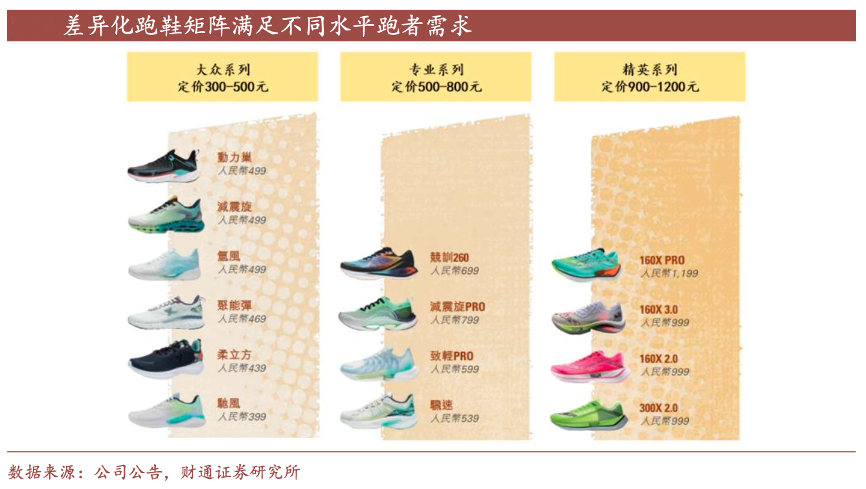 經典案例:根據公司公告、財通證券研究所等綜合資訊表明,針對入門跑者特步公司推出了可以滿足消費者舒適感需求的大眾系列跑鞋,定位 300-500 元價格帶;針對養成跑步習慣或需要滿足日常訓練需求的跑者,公司推出兼具功能和舒適感的專業系列跑鞋,定位 500-800 元價格帶;針對專業競賽級跑者,公司推出推進力、回彈、減震性能較高的精英系列跑鞋,定位 900 元以上價格帶。三大系列可以滿足不同專業度、不同消費能力的跑者需求,實現對客群較為全面的覆蓋。