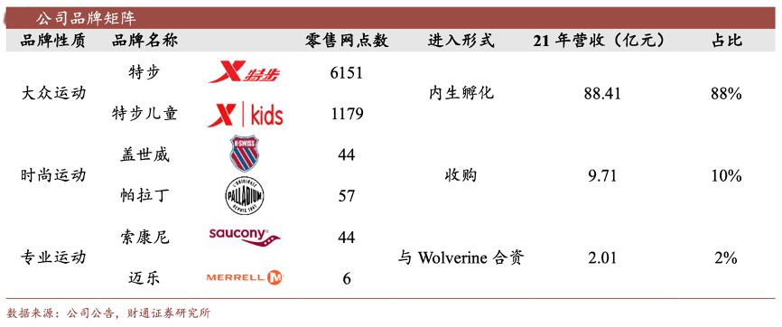 經典案例:根據公司公告、財通證券研究所等綜合資訊表明,歷經品牌初創及快速發展期(2001-2011)、行業調整期 (2012-2014)、戰略變革期(2015-2018),特步公司目前已經發展成為一家多品牌集團, 形成了涵蓋大眾運動(特步主品牌)、專業運動(索康尼、邁樂)、時尚運動(帕 拉丁、蓋世威)的多品牌矩陣,覆蓋從大眾到中高端的客戶群體。