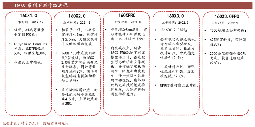 經(jīng)典案例:根據(jù)特步公眾號、財通證券研究所等綜合資訊表明,在獲得積極的市場反饋后,特步對 160X 跑鞋進行進一步升級,以 6 個月左右的迭代頻率推出全新版本,對回彈、緩震、推動等性能進行進一步加強,2022年 9 月 160X 系列已推出 3.0PRO 版本。冠軍跑鞋的持續(xù)升級體現(xiàn)出公司日益成熟的產(chǎn)品迭代思路。