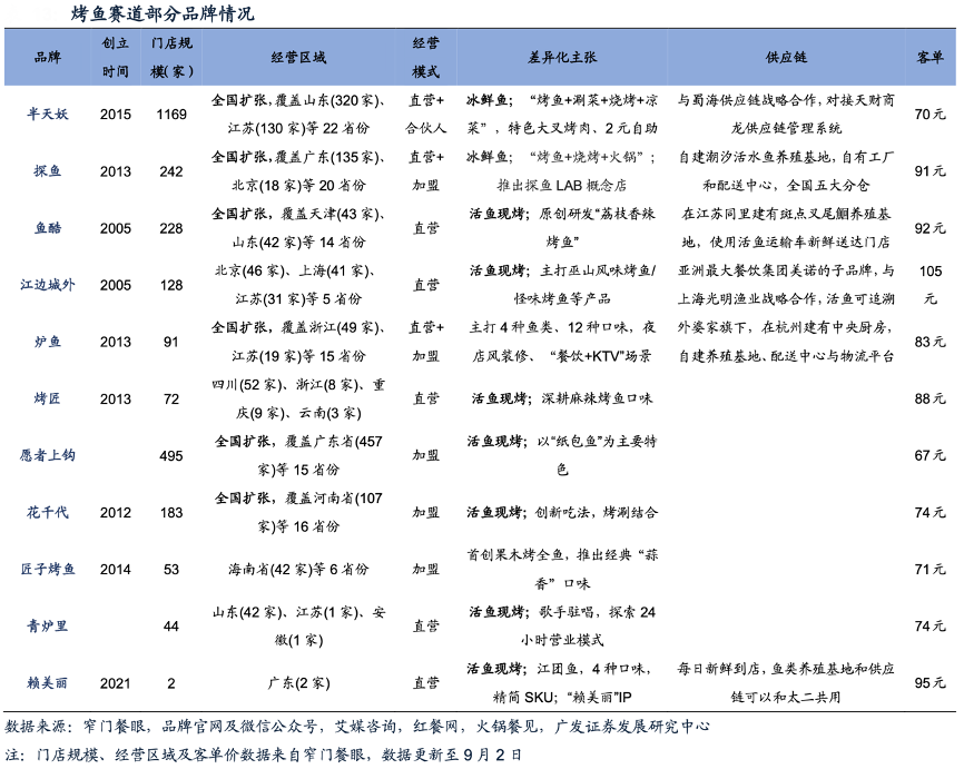 經典案例:根據窄門餐眼、品牌官網及微信公眾號、艾媒咨詢、紅餐網、火鍋餐見、廣發證券發展研究中心等綜合資訊表明,烤魚品牌主要在產品、營銷、品牌、 場景等多方面進行創新,如探魚創新“烤魚+燒烤+火鍋”模式,爐魚以夜店風裝修、“餐飲+KTV”模式等引流年輕消費者,江邊城外主打巫山風味烤魚/怪味烤魚產品。