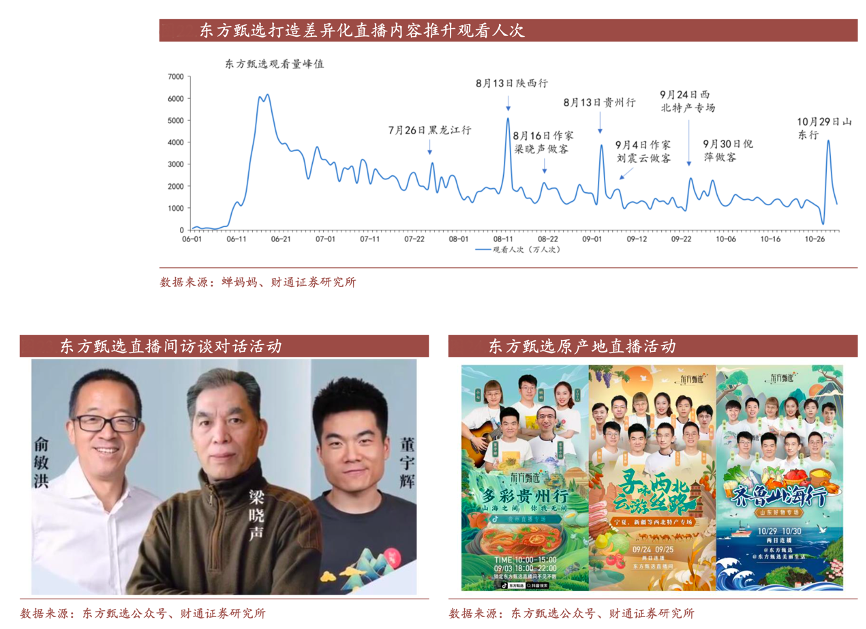 經典案例:根據東方甄選公眾號、蟬媽媽、財通證券研究所等綜合資訊表明,東方甄選公司通過戶外原產地直播、名人訪談對話形式拉升直播間觀看人次。以東方甄選為代表的內容向直播間帶貨過程中,人文知識等內容講解時長占比較高,通常轉化率相對不足。相比之下偏賣場式的直播間,轉化率更高,商品介紹流轉更快,而觀眾停留時長較低。