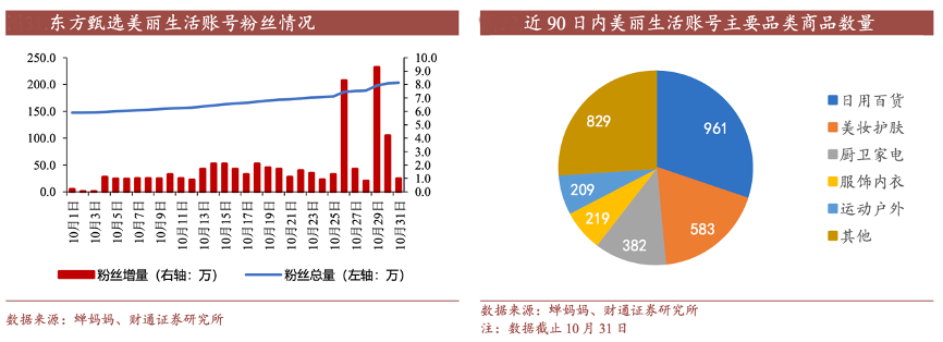 經典案例:根據蟬媽媽、財通證券研究所等綜合資訊表明,美麗生活賬號粉絲數量穩步提升,直播間入駐美妝大牌數量持續增長,已上架商品中包含歐萊雅、Olay、SK-2 等美妝大牌,該賬號在雙十一美妝專場直播中單日GMV 達到 6800 萬元,印證了其增長潛力。