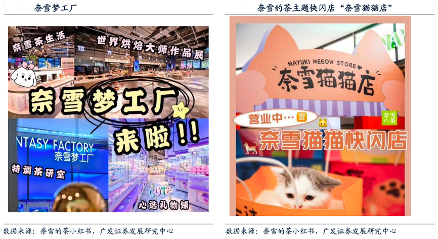 經(jīng)典案例:根據(jù)奈雪的茶小紅書(shū)、廣發(fā)證券發(fā)展研究中心等綜合資訊表明,2019年奈雪推出全國(guó)首家“奈雪夢(mèng)工廠”,全店擁有超過(guò)1000個(gè) SKU,給消費(fèi)者帶來(lái)多重體驗(yàn);目前,奈雪夢(mèng)工廠將升級(jí)改造為“奈雪生活”,提 供烘焙茶飲、閱讀空間、花藝、簡(jiǎn)餐等服務(wù)。此外,奈雪亦推出“奈雪貓貓店”、 “奈雪×夢(mèng)華錄”等主題快閃店,以此吸引不同的消費(fèi)人群。