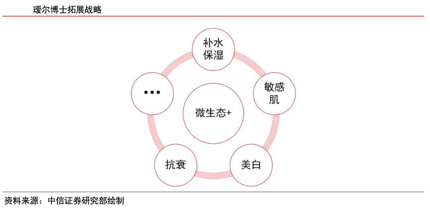 經(jīng)典案例:根據(jù)中信證券研究部等綜合資訊表明,璦爾博士圍繞皮膚微生態(tài),逐步探索皮膚微生態(tài)與補(bǔ)水保濕、敏感肌、美白、抗衰等功能的關(guān)系;在品類內(nèi)部,璦爾博士著力打造優(yōu)勢(shì)產(chǎn)品,提升品類滲透擊穿品類。