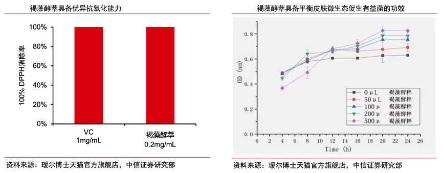 經(jīng)典案例:根據(jù)璦爾博士天貓官方旗艦店、中信證券研究部等綜合資訊表明, 2018 年 6 月,璦爾博士公司合作方齊魯工業(yè)大學(xué)將褐藻精粹制備方法“益生菌發(fā)酵制備海藻 發(fā)酵液的方法及該海藻發(fā)酵液在化妝品中的應(yīng)用”申請(qǐng)國(guó)家發(fā)明專利,實(shí)施例證明璦爾博士益生菌發(fā)酵制備的海藻發(fā)酵液活性成分種類和含量高。2022 年,褐藻成分也登陸美麗修行聯(lián)合中國(guó)國(guó)家地理拍攝的紀(jì)錄片《這就是中國(guó)成分》,紀(jì)錄片詳細(xì)記錄了褐藻酵萃的研發(fā)過程,成為中國(guó)特色功效成分的一張名片。