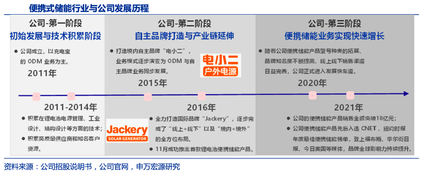 經典案例:根據公司招股說明書、公司官網、申萬宏源研究等綜合資訊表明,華寶新能2011年成立,早期業務以充電寶 ODM 為主。從2020年開始其進入發展新的階段,在便攜式儲能行業實現規模引領,品牌全球知名度不斷提升。20 年戶外露營需求在美國、歐洲等海外市場開始爆發,便攜式儲能作為精致露營的必備品受到戶外人群的青睞,2021 年全球便攜式儲能市場規模隨即突破百億,行業進入快速滲透期。