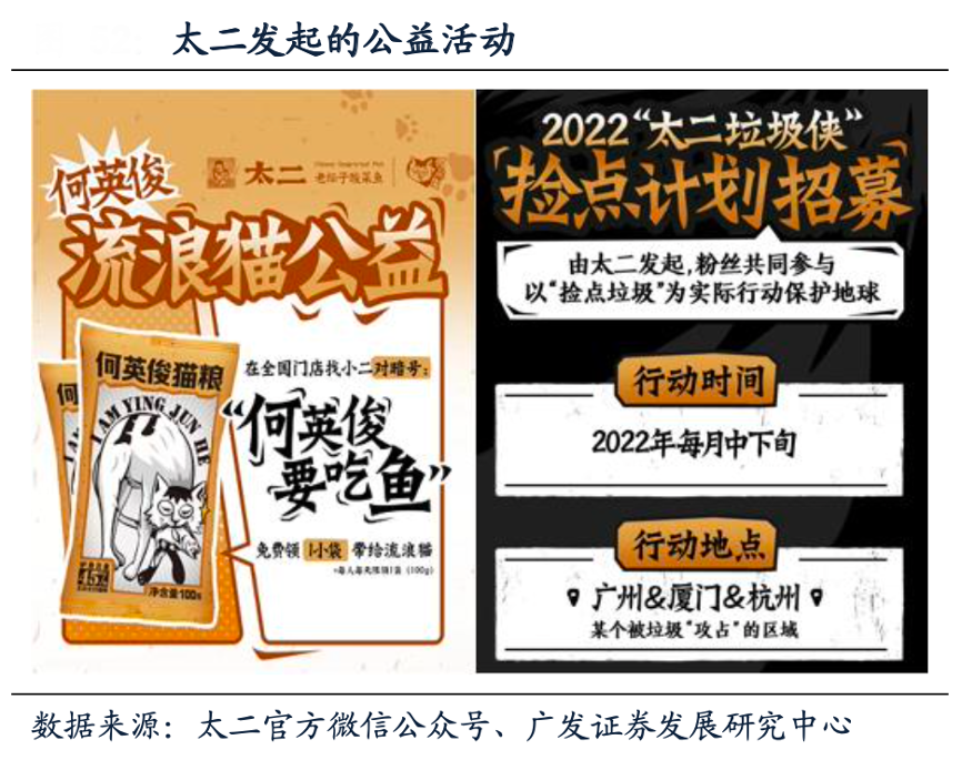 經典案例:根據太二官方微信公眾號、廣發證券發展研究中心等綜合資訊表明,太二圍繞“二”文化打造品牌IP占領年輕人心智,太二打造了“二老板”和“小二哥”兩個詼諧有趣的漫畫形象并借此和年輕人互動,門店裝修和店內宣傳標語也主打黑白色詼諧漫畫風,與品牌人設保持一致。太二通過微信公眾號、微博、小紅書和粉絲微信群等渠道傳播上新、優惠和開業等信息,還發起“何英俊貓糧”、“太二垃圾俠” 等符合年輕人價值觀的公益活動。