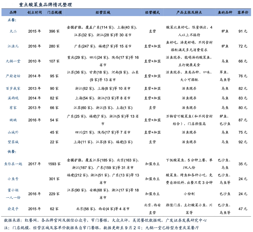 經典案例:根據紅餐網、各品牌官網及微信公眾號、窄門餐眼、大眾點評、美團餐飲數據觀、廣發證券發展研究中心等綜合資訊表明,從門店規模來看,據窄門餐眼數據,截至22年9月2日,太二門店396家,領先第二名 江漁兒100多家(江漁兒部分門店是“社區小店+外賣”模式)。區域分布來看,太二門店已經滲透全國30省市,而其他品牌布局地域 性較強,江漁兒近90%門店位于廣東,九鍋一堂主要布局川渝。