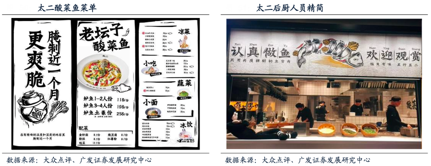 經典案例:根據大眾點評、廣發證券發展研究中心等綜合資訊表明,太二“輕服務+標準化備菜流程+中央廚房”縮減員工成本,其將備菜流程標準化,酸菜魚備菜僅需三名員工(一名負責燙魚片,一名負責煮湯和準備配菜,一名負責淋油),出餐效率高且新員工培訓難度大大降低,太二店均員工人數在27人左右(廚房14人,服務員13人)。