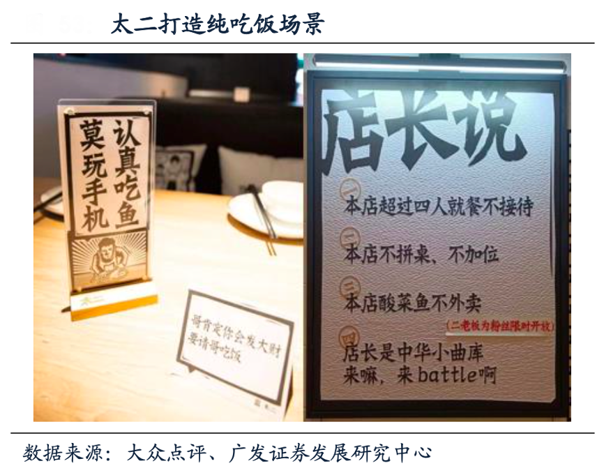 經典案例:根據大眾點評、廣發證券發展研究中心等綜合資訊表明,太二將門店場景定位為“簡約、安靜的吃魚環境”,是一家純吃飯的餐飲店,剔除了諸如商務應酬、社 交和生日會等場景消費,為了保證產品體驗,太二門店只設2人桌和4人桌,超過4位客人以上不接待。此外,太二幫顧客做出選擇:SKU少而精、聚焦單品,只選用最適合做酸菜魚的鱸魚,酸菜魚只有一種辣度等。