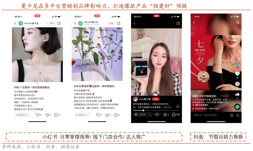 經典案例:根據小紅書、抖音、招商證券等綜合資訊表明,曼卡龍品牌爆品“指愛針”在2021年 520,2022年 520 和七夕多次營銷,放量大幅拉動鑲嵌產品的銷售,其在小紅書、抖音等媒介通過日常穿搭推薦、與線下商場門店以及達人合作等方式深化品牌定位,精準客戶畫像。“指愛針”的營銷內容在抖音達到 7.9 億播放量,互動3000+萬,520、七夕期間,爆款項鏈在天貓、京東的單品銷量榜均為第一。