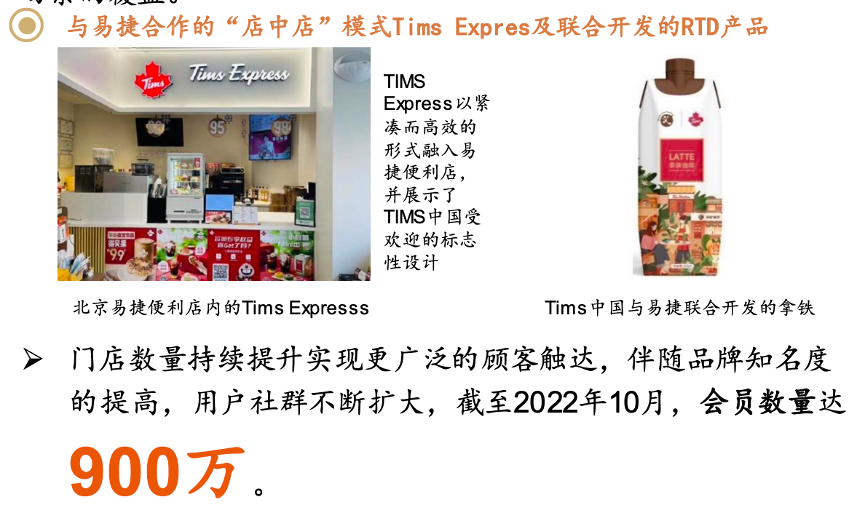 經(jīng)典案例:根據(jù)公司公告、平安證券研究所等綜合資訊表明,2022年7月25,Tims中國和有1.9億忠實會員的 中石化旗下易捷便利店連鎖企業(yè)達成合作,一方面在易捷2.78 萬多家便利店網(wǎng)絡中銷售聯(lián)合品牌的即飲咖啡產(chǎn)品(RTD), 并在中國各地精選部分易捷門店,以“店中店”的模式開設 Tims Express門店,進一步擴大Tims門店網(wǎng)絡及在中國的消費場景的覆蓋。