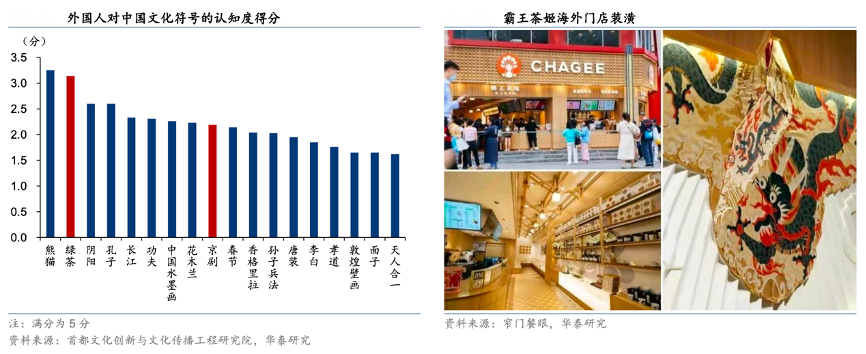 經(jīng)典案例:根據(jù)首都文化創(chuàng)新與文化傳播工程研究院、窄門餐眼、華泰研究等綜合資訊表明,霸王茶姬將“中國茶”和“戲劇”這兩大知名度較高的中國文化元素與自身品牌綁定,使得品牌獲得較高的文化附加值。據(jù)首都文化創(chuàng)新與文化傳播工程研究院調(diào)研(樣本為 2407 位外國普通民眾),“綠茶”和“京劇”的外國人認知度分別位列中國文化符號的第 2 位與第 9 位。此外,其通過中國風(fēng)裝潢在海外營造了一個良好的沉浸體驗式國風(fēng)場景。