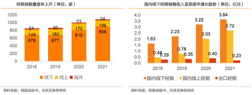 經典案例:根據招股說明書、天風證券研究所等綜合資訊表明,2018-2021年,五糧液公司國內線下經銷銷售收入呈現逐年增長趨勢,主要由于公司加快營銷網絡的全國布局,不斷進行渠道下沉,在完成地市州的經銷商網絡布局后,逐步拓展并開發縣區級經銷商,形成了“扁平渠道、深度分銷”的經銷商網絡體系。