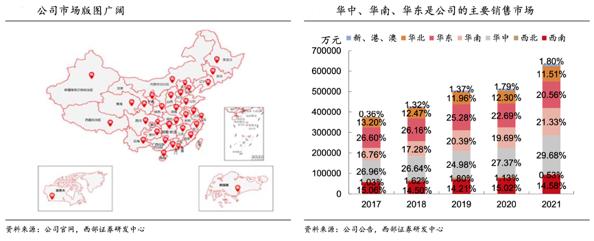 經典案例:根據公司官網、公司公告、西部證券研發中心等綜合資訊表明,絕味食品得益于加盟模式的驅動,公司門店數量快速增長,成功構建了覆蓋全國的銷售網絡。近年來公司的區域布局較為穩定,華中、華南、華東地區是公司的主要銷售市場,營業收入穩步上升, 2021 年合計為公司貢獻超七成營業收入。