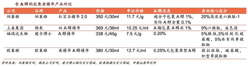 經(jīng)典案例:根據(jù)珀萊雅、韓束公司官網(wǎng)、璦爾博士微信官方商城、申港證券研究所等綜合資訊表明,選取市面上含有 A 醇的四款熱門抗衰老精華產(chǎn)品對比發(fā)現(xiàn),珀萊雅紅寶石精華 2.0 價格上低于國際品牌歐萊雅夜精華 A 醇。和國貨品牌韓束雙 A 醇精華、璦爾博士 A 醇精華相比,紅寶石精華 2.0 添加的勝肽濃度最高,抗老效果好,配合 A 醇能達到更強的抗老效果。