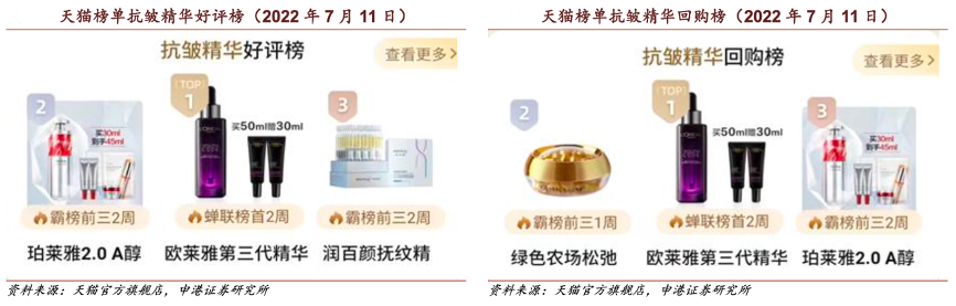 經(jīng)典案例:根據(jù)天貓官方旗艦店、申港證券研究所等綜合資訊表明,“紅寶石精華”在天貓榜單抗皺精華好評榜與回購榜中持續(xù)霸榜前三,僅次于歐萊雅第三代精華。
