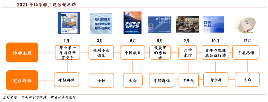 經(jīng)典案例:根據(jù)珀萊雅官方微博、申港證券研究所等綜合資訊表明,珀萊雅 2021 年各月份先后開展主題營 銷活動,與用戶深度對話。其在1月“畢業(yè)第一年”活動面向年輕職場人群,10月聯(lián)合《中國青年報》、壹心理發(fā)起“珀萊雅 青年心理健康公益行動-回聲計劃”,聚焦青少年成長,彰顯品牌社會責(zé)任擔(dān)當(dāng);12 月年度感謝活動收集 76 條用戶聲音,制作新年卡片贈予消費(fèi)者。
