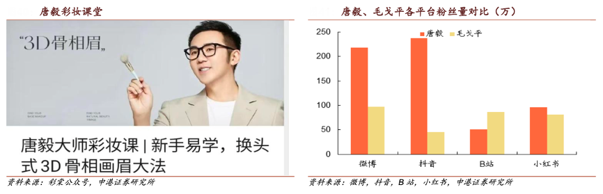 經(jīng)典案例:根據(jù)彩棠公眾號、微博、抖音、B站、小紅書、申港證券研究所等綜合資訊表明,彩棠公眾號上持續(xù)開設(shè)唐毅大師系列彩妝教學(xué),連接用戶提升品牌傳播度。相比同樣擁有自主品牌的明星化妝師毛戈平,唐毅在微博、抖音、小紅書上的粉絲量分別為 218.5 萬、237.8 萬、96.2 萬,均高于毛戈 平。