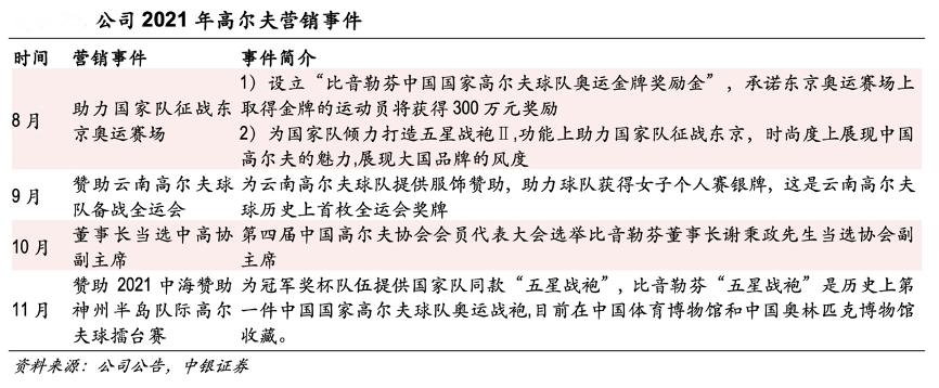 經典案例:根據公司公告、中銀證券等綜合資訊表明,高爾夫基因不僅是比音勒芬品牌內涵的保障,更是品牌營銷、形象打造的有力支撐點。近年來,公司不斷基于高爾夫文化展開營銷宣傳,包括贊助影響力較大的專業高爾夫賽事、在專業高爾 夫雜志上投放宣傳廣告以及在高爾夫球會開設店鋪等等,廣泛傳播其專業高爾夫服飾的品牌形象。