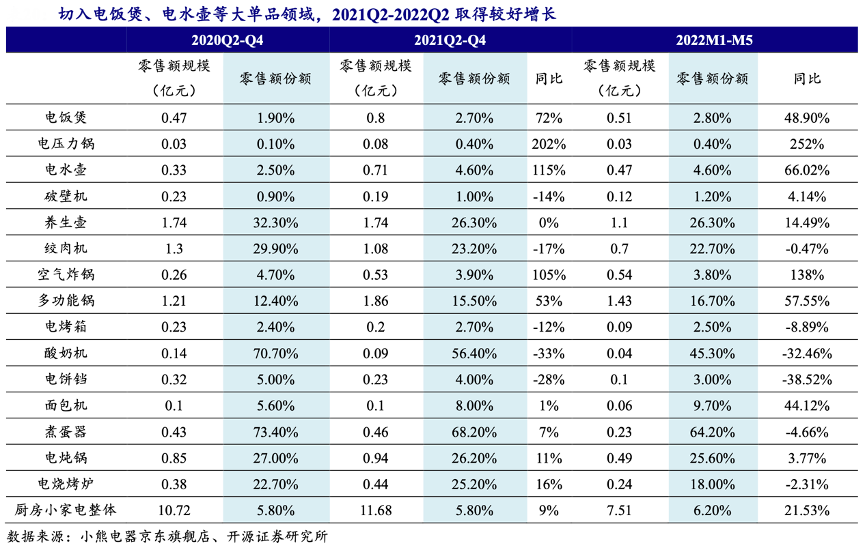 經典案例:根據小熊電器京東旗艦店、開源證券研究所等綜合資訊表明,隨著小熊電器發力電飯煲、空氣炸鍋、電水壺等大單品領域,或推升小熊電器整體成長空間,擺脫長尾品類帶來的成長限制。2021Q2-Q4 小熊電器電飯煲、電水壺、空氣炸鍋京東渠道零售額同比分別+72%、+115%、+105%。2022M1-M5 電飯煲、電水壺、空氣炸鍋京東渠道零售額同比分別+48.9%、66.02%、138%。