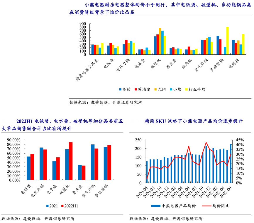 經典案例:根據魔鏡數據、開源證券研究所等綜合資訊表明,早期小熊電器通過多 SKU 特征覆蓋更多人群,但帶來 較多高流量價值低銷售價值的產品,當前小熊電器更多聚焦產品品質,推行精簡 SKU 戰略。魔鏡數據顯示小熊電器 2022H1 電飯煲、電水壺、破壁機、多功能鍋細分品類前五大單品銷售額合計占比較 2021 年有所提升。