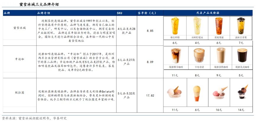 經典案例:根據蜜雪冰城招股說明書、華泰研究等綜合資訊表明,蜜雪冰城現擁有三大現制飲品品牌——現制茶飲“蜜雪冰城”、現磨咖啡“幸運咖”和現制冰淇淋連鎖品牌“極拉圖”。 據公司官網及窄門餐眼,蜜雪冰城目前有 4 大品類共 28 款產品,客單價為 8.85 元;幸運 咖主打現磨咖啡,共擁有 5 大品類 27 款產品,客單價 8.09 元;極拉圖共 3 大品類,主打手工冰激凌系列,客單價 17.82 元。其中,主力品牌蜜雪冰城產品價格帶集中在 6-8 元區間,憑借性價比定位在消費者心中形成了較高的品牌認知。