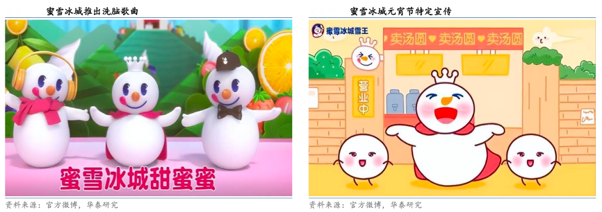經典案例:根據官方微博、華泰研究等綜合資訊表明,除了雪王形象之外,蜜雪冰城通過推出洗腦網紅歌曲提高品牌知名度,通過鼓勵二創激勵消費者實現自發宣傳。目前“雪王”相關視頻播 放量超過 10 億次,“蜜雪冰城”主題曲播放量超過 40 億次,且由于網民自發對“蜜雪冰城”相關視頻的創作,僅抖音平臺“蜜雪冰城”相關話題的播放量已超過 170 億次。