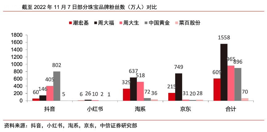 經(jīng)典案例:根據(jù)抖音、小紅書(shū)、淘系、京東、中信證券研究部等綜合資訊表明,CHJ 潮宏基以唐藝昕為代言人,F(xiàn)ION 菲安妮簽約青年演員喬欣作為品牌代言人,繼續(xù)強(qiáng)化公司年輕化品牌形象。通過(guò)高熱度的年輕化 IP 產(chǎn)品和逐年增長(zhǎng)的廣告宣傳費(fèi)用,2021 年末公司已有約 1400 萬(wàn)會(huì)員。截至 2022 年 11 月 7 日,公司在抖音、小紅書(shū)、淘系、京東平臺(tái)上吸引并聚集了約 609 萬(wàn) 粉絲。