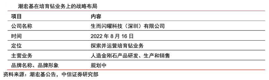經(jīng)典案例:根據(jù)潮宏基公告、中信證券研究部等綜合資訊表明,潮宏基公司與培育鉆生產(chǎn)商合作運(yùn)營(yíng)培育鉆業(yè)務(wù),產(chǎn)業(yè)鏈協(xié)同效應(yīng)提高市場(chǎng)競(jìng)爭(zhēng)力。2022 年 8 月 16 日,其與河南省力量鉆石股份有限公司等合作方簽訂了《公司設(shè)立協(xié)議書(shū)》,出資 1100 萬(wàn)元(占股55%)與合作方共同投資設(shè)立生而閃曜科技(深圳)有限公司(以下簡(jiǎn)稱(chēng)“生而閃曜”),創(chuàng)建并運(yùn)營(yíng)培育鉆石珠寶首飾品牌,共同探究、經(jīng)營(yíng)培育鉆業(yè)務(wù)。生而閃曜主營(yíng)業(yè)務(wù)為人造金剛石產(chǎn)品研發(fā)、生產(chǎn)和銷(xiāo)售。