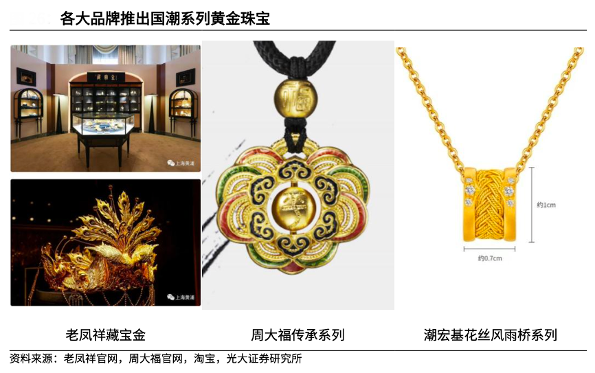 經(jīng)典案例:根據(jù)老鳳祥官網(wǎng)、周大福官網(wǎng)、淘寶、光大證券研究所等綜合資訊表明,各大黃金珠寶品牌均注重結(jié)合中國傳統(tǒng)文化進行新品設(shè)計,推出了一系列國潮風(fēng)格的黃金珠寶。例如,老鳳祥在 2022 年 9 月舉辦“老鳳祥藏寶金”首發(fā)儀式,展現(xiàn)主題產(chǎn)品“繡風(fēng)華”、“青綠國色”等系列;周大福的傳承系列的成功是其 FY2022 黃金首飾及產(chǎn)品營業(yè)額提升的重要推動;潮宏基也在 2022 年 4 月推出了花絲風(fēng)雨橋系列,受到廣泛歡迎。
