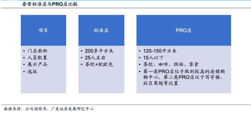 經典案例:根據公司招股書、廣發證券發展研究中心等綜合資訊表明,奈雪公司自2020年11月推出奈雪 的茶PRO店。相較于奈雪的茶標準店,奈雪PRO店移除了現場面包房區域,門店面積更小,人員配置更少,租金及人工成本更低。其產品類別更加多樣,且在選址上更加靈活,不僅可以布局于連鎖購物中心,還能進駐寫字樓、社區等標 準店較難進入的區域。
