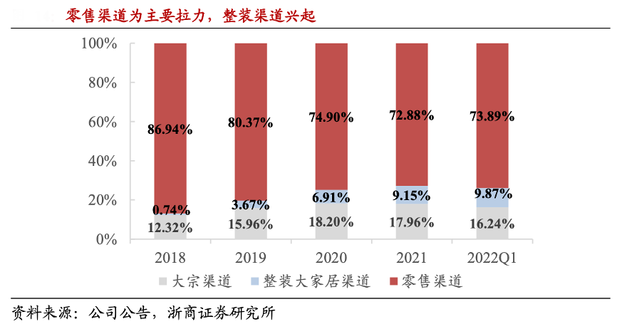 經典案例:根據公司公告、浙商證券研究所等綜合資訊表明,歐派始終將擴大訂單數和市場份額放在第一位,在流量入口的開拓上成效顯著。傳統零售渠道占比從 18 年的 87%下降至 22Q1 的74%, 大宗業務渠道 2020 年占比達到 18%高點后、開始穩中有降。2018 年以來,整裝大家居渠 道開始興起,增長快速,占比逐年提升至 10%。
