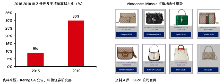 經典案例:根據Kering SA公告、Gucci公司官網、中信證券研究部等綜合資訊表明,Alessandro Michele接任創意總監以來,將街頭時尚注入品牌基因,產品設計在尊重品牌經典主流設計的前提下融合當代美學,受到年輕客群的追捧,自接任以來幾乎每年都打造一款標志性 爆款,例如 2015 年 Dionysus 酒神包采用標志性的雙虎頭馬蹄扣,并在基礎包型之上加入 雙 G 帆布印花、竹節等品牌經典元素。2015-2019 年 Gucci 的客群結構亦發生了巨大變化,Z 世代及千禧年客戶占比從 9% 大幅提升至 30%,品牌年輕化戰略獲得顯著成效。