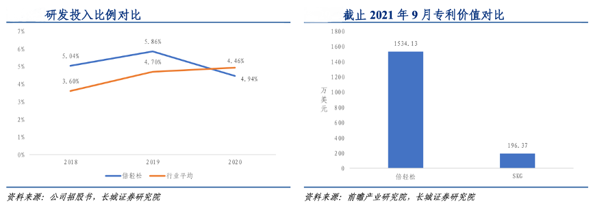 經(jīng)典案例:根據(jù)公司招股書、前瞻產(chǎn)業(yè)研究院、長城證券研究院等綜合資訊表明,與行業(yè)平均水平相比,2018-2020年倍輕松公司研發(fā)投入占營業(yè) 總收入的比例分別為 5.04%、5.86%、4.46%,分別高出行業(yè)平均水平 1.44、1.16、-0.48 個百分點。通過較高的研發(fā)投入,公司專利價值也領(lǐng)先于同行業(yè)其他企業(yè)。截止 2021 年 9 月,倍輕松的專利價值約為 1534.13 萬美元,高出 SKG 1337.76 萬美元。