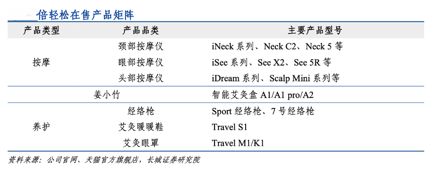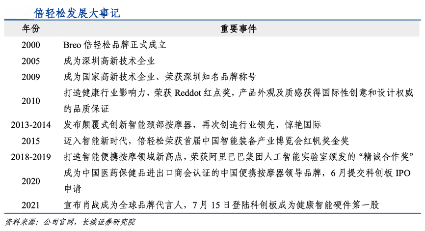 經(jīng)典案例:根據(jù)公司官網(wǎng)、長城證券研究院等綜合資訊表明,倍輕松公司自成立以來便專注于小型便攜智能按摩器具的設(shè)計、研發(fā)、生產(chǎn)、銷售及服務(wù),不斷推動現(xiàn)代科學(xué)技術(shù)與傳統(tǒng)中醫(yī)理論的有機結(jié)合。經(jīng)過二十余載的耕耘,公司 先后獲得境內(nèi)外重要獎項十余項,成為中國智能按摩器具行業(yè)領(lǐng)軍企業(yè)。2021 年 7 月 15 日,公司成功IPO,成為我國健康智能硬件第一股。